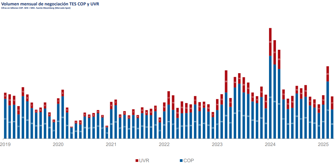 El volumen de negociación de la deuda pública en marzo se ubicó en COP 54,4 billones. Esto representa una disminución anual del 52,4%, y una disminución mensual del 41,6%, debido principalmente a una importante disminución en la negociación de TES COP.