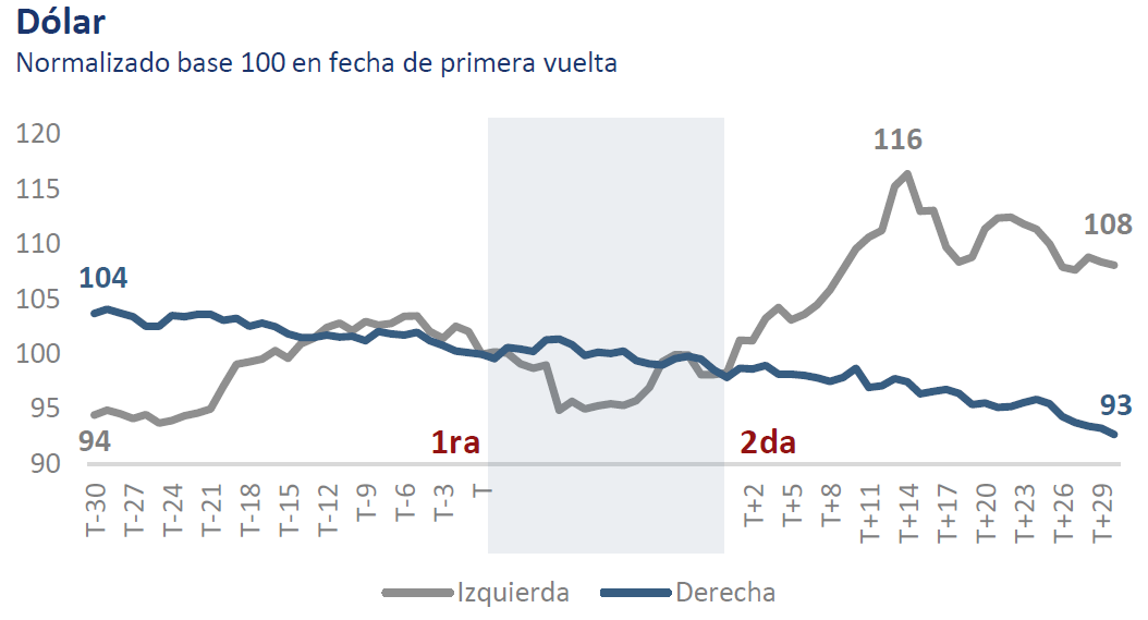 En contraste, ante un triunfo de la derecha, el dólar se depreció un 11% (equivalente a COP 450 pesos colombianos), la deuda pública a 10 años en moneda local se mantuvo relativamente estable, el riesgo país se redujo en un 24% y las acciones subieron un 31%.