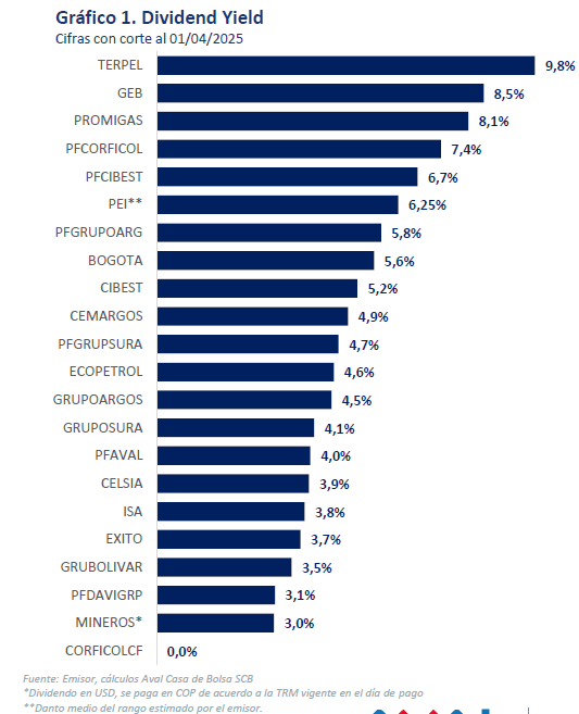 Los dividendos decretados en 2026 tienen una dispersión entre emisores, teniendo en cuenta su desempeño financiero en el 2025, los retos percibidos para el 2026, y las necesidades de inversión y crecimiento. En general, dado el retorno del Colcap durante el 2025 (+49,9%), se tienen mayores precios de las acciones, por lo que el Dividend Yield se reduce por efecto base.