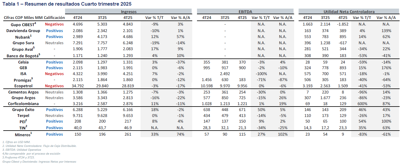 Sector Financiero: Los resultados del 4T25 fueron mixtos para las entidades bancarias, aunque en general se destaca como positiva la mejora generalizada de la Calidad de Cartera (menor cartera en mora), una variable que será clave de cara al nuevo ciclo alcista de tasas de interés, que ya acumula dos subidas de 100 pbs en lo que va del año.