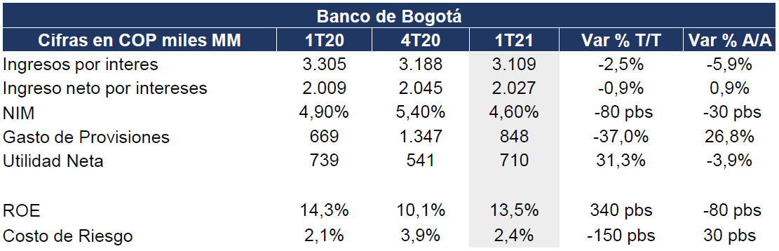 Cartera de crédito crece liderada por Cartera Hipotecaria: El crecimiento de la cartera se evidenció específicamente en el segmento Hipotecario (+13,4% A/A y +7,3% T/T), al pasar desde COP 18 BN al 1T20 a COP 20,5 BN para el 1T21. Del mismo modo, el banco presentó crecimientos en el segmento de cartera Comercial (+5,8% A/A y +4,4% T/T) y Consumo (+2,5% A/A y +5,3% T/T), soportado en la reactivación económica dentro del país como en Centroamérica.