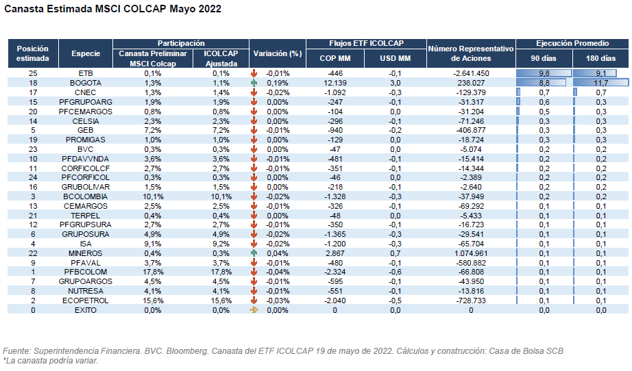 El próximo 31 de mayo se realizará el rebalanceo del índice MSCI Colcap, en línea con los índices MSCI a nivel global. La canasta preliminar fue publicada el jueves 19 de mayo de 2022 y la entrada en vigor de la canasta definitiva está programada para el miércoles 1 de junio de 2022. Tal como anticipamos previamente, en esta edición no se presentarán adiciones ni eliminaciones y no se presentaron cambios significativos en las ponderaciones de los componentes de la canasta de referencia. En contraste a nuestras estimaciones preliminares destacamos flujos compradores en Banco de Bogotá y Mineros, donde el flotante se incrementó desde 6% y 40% hacia 7% y 45%, respectivamente.