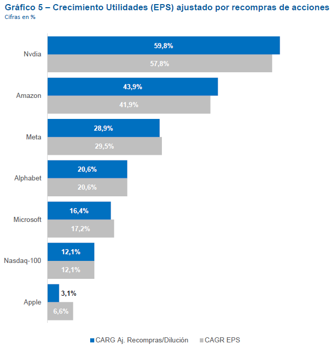El análisis que realizamos en este informe sobre la última década (periodo 2015–2025) muestra que las seis grandes tecnológicas del Nasdaq (con presencia en el Mercado Global Colombiano) multiplicaron por más de 2 veces el ritmo de crecimiento del índice. Mientras el Nasdaq-100 registró un CAGR de EPS del 12,1% y un ROE estable (+1,4 p.p.), las empresas evaluadas exhibieron un crecimiento (CAGR) medio del 28,6% y un incremento conjunto de ROE de +48,8 p.p. NVIDIA y Amazon lideran con expansiones del EPS de 57,8% y 41,9% anuales, impulsadas por la demanda en IA y Cloud, respectivamente; Meta, Alphabet y Microsoft mantienen trayectorias sólidas, combinando recompras y eficiencia operativa, mientras que Apple destaca más por su buena gestión financiera que por crecimiento real, con un ROE inflado (+107 p.p.) gracias a una reducción del 33,5% de su base accionaria.