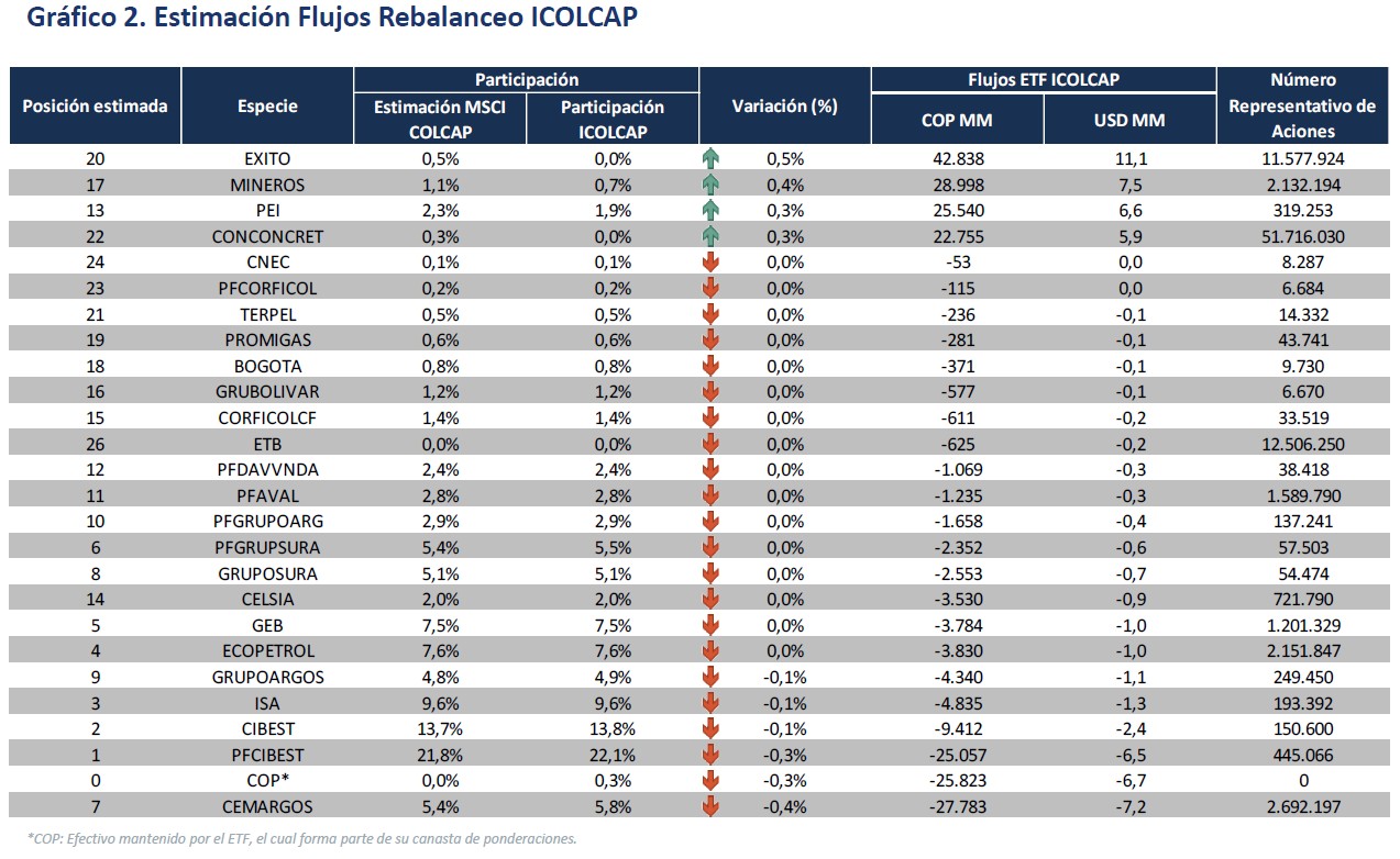 - Flujos de venta estimados: Los principales flujos de salida corresponderían a Cementos Argos y a las dos especies de Grupo Cibest (Pf y Ord), explicado la disminución en su ponderación de -0,4%, -0,3% y -0,1% respectivamente.