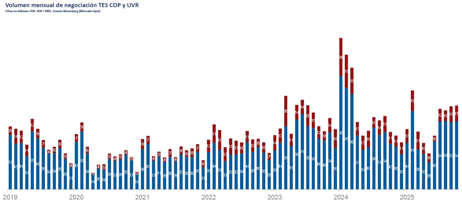 El volumen de negociación mensual de la deuda corporativa se ubicó en COP 23,8 billones durante octubre. En términos mensuales, el volumen de negociación aumentó un 21,7%, y en términos anuales aumentó un 49,4%. Las captaciones primarias alcanzaron COP 10,7 billones, con una disminución del 28,6% en comparación con octubre de 2024.