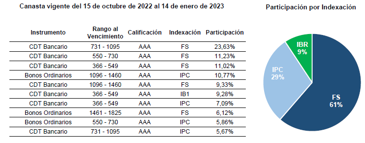 - Para la construcción de la canasta que entra en vigencia en el periodo 15 de octubre de 2022 al 14 de enero de 2023 se utilizaron datos de negociación de los meses julio, agosto y septiembre de 2022. La unidad se actualizará todos los jueves y estará disponible aquí. Para conocer la metodología del índice haga clic aquí.