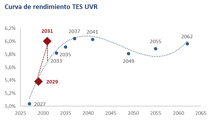 Identificamos valor en los TES UVR 2031 porque estamos en un ciclo de inflaciones mensuales al alza, que suele extenderse hasta el primer trimestre de 2026. Además, su spread frente a los TES UVR 2029 se encuentra en máximos históricos, y este título es el que más se aleja de la curva de TES UVR, en un entorno donde los plazos más largos ofrecen tasas más bajas, por lo que, si el Gobierno decide aumentar la oferta de títulos para financiarse, lo haría en esos tramos.
